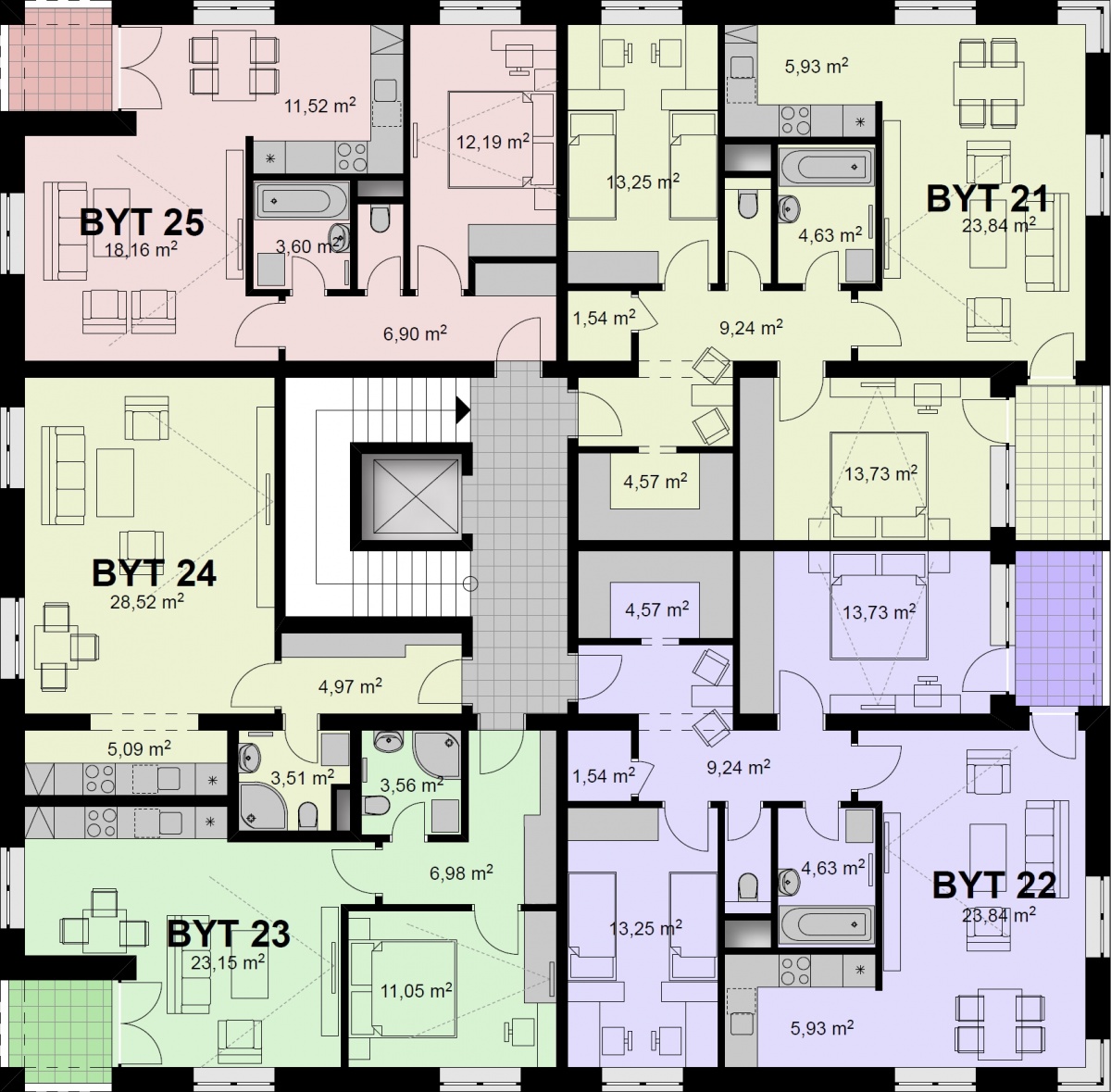 Bytové domy budou vystavěny postupně. Každý bytový dům obsahuje 23 bytových jednotek o velikosti 33 až 103 m2 včetně lodžie, 8 parkovacích míst a sklepy v suterénu budovy pro každou bytovou jednotku a dostatečný prostor pro parking v okolí domu. Všechny byty, mimo jedné přízemní garsoniéry, disponují lodžií nebo terasou. Pro výstavbu jsou použity kvalitní materiály, domy jsou zděné.